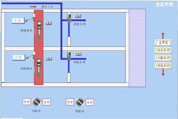 ● 儲鹽溶鹽池設計方式,溶鹽池通過超聲波液位計自動補充軟水,保證長期不間斷供應飽和鹽水。