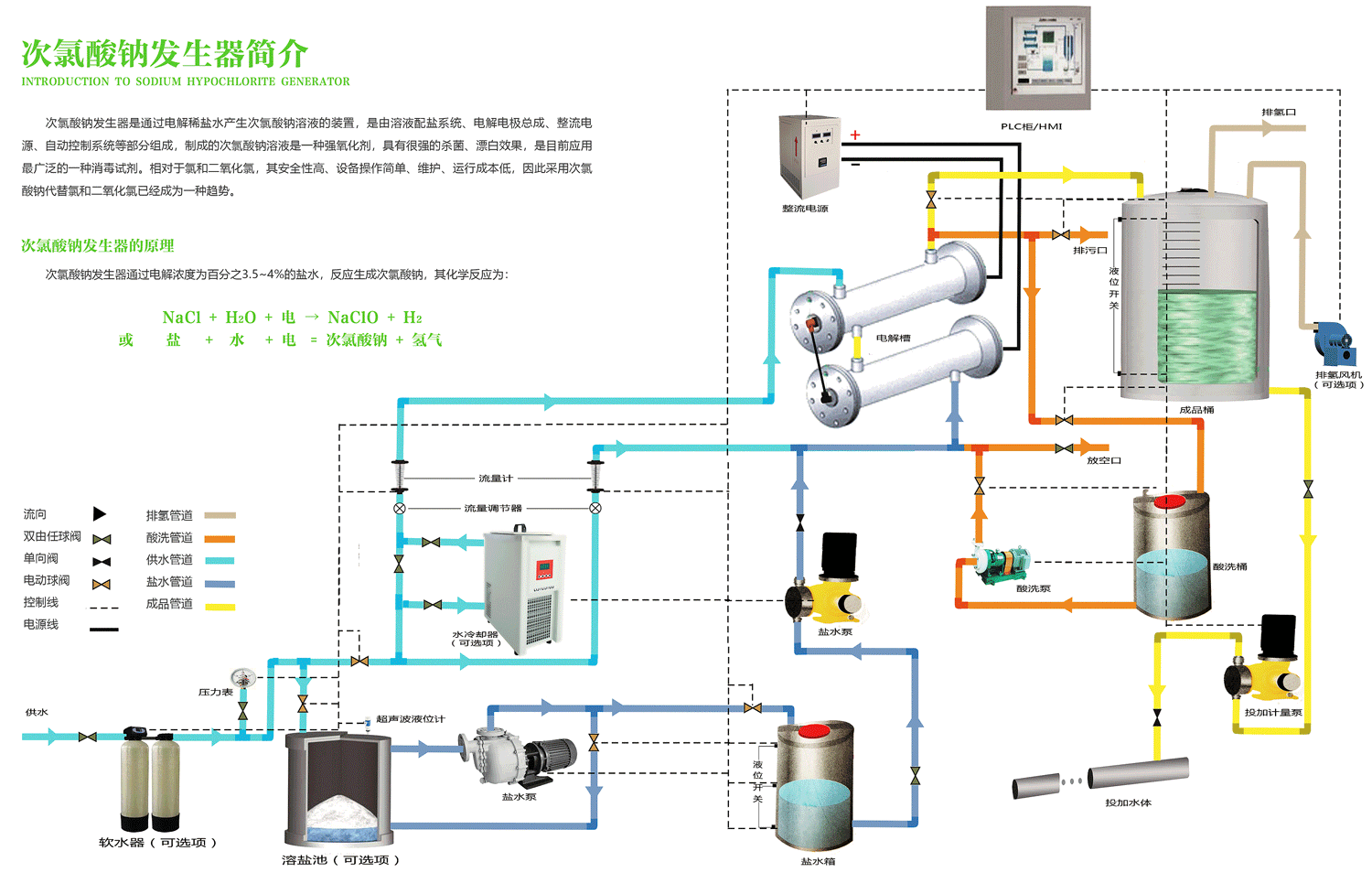 次氯酸鈉發(fā)生器是通過電解稀鹽水產生次氯酸鈉溶液的裝置,是由溶液配鹽系統(tǒng)、電解電極總成、整流電源、自動控制系統(tǒng)等部分組成,制成的純凈次氯酸鈉溶液是一種強氧化劑,具有很強的殺菌、漂白效果,是目前應用最廣泛的一種消毒劑。